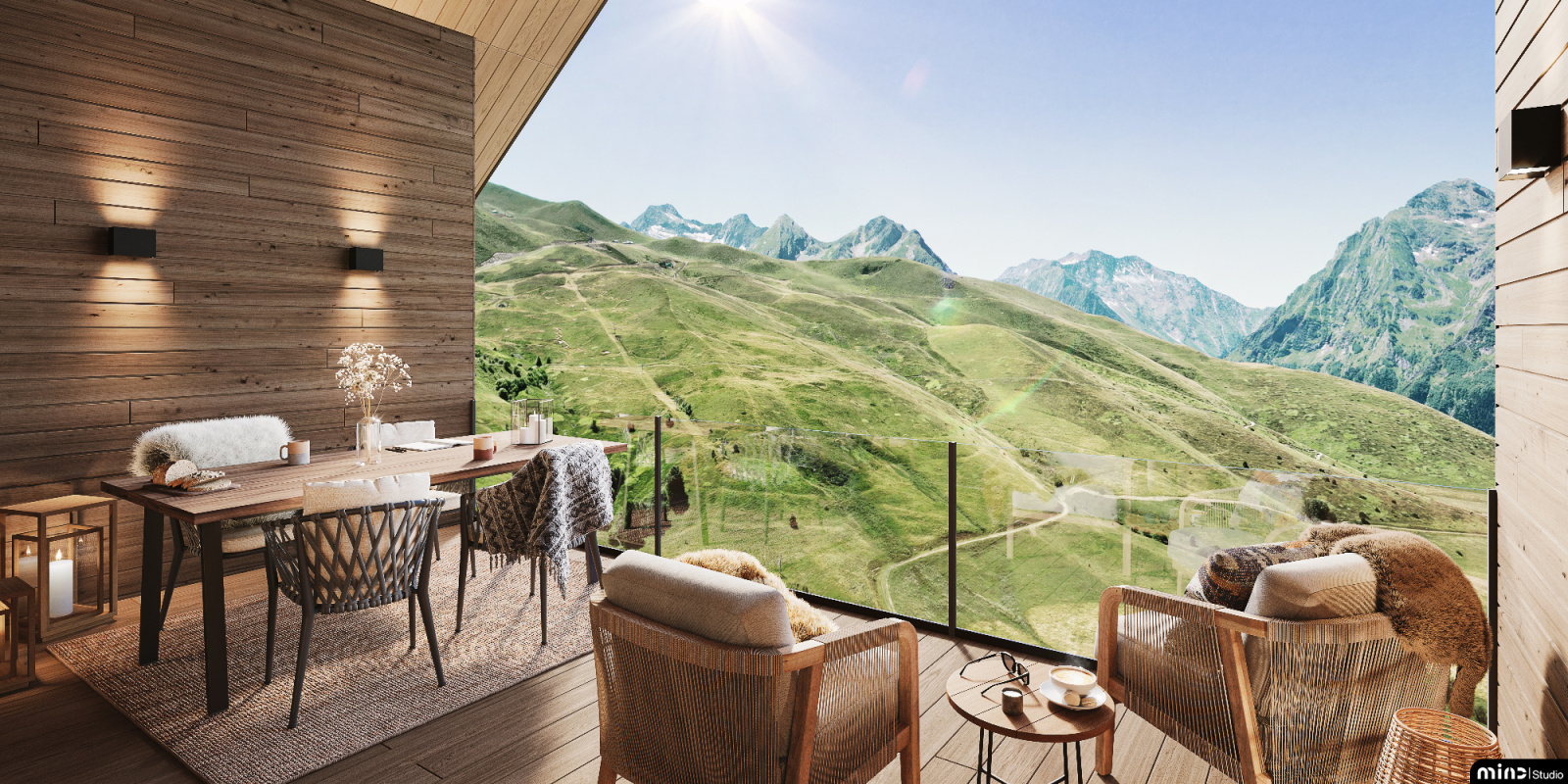 •Terrasse en bois avec vue imprenable sur les sommets