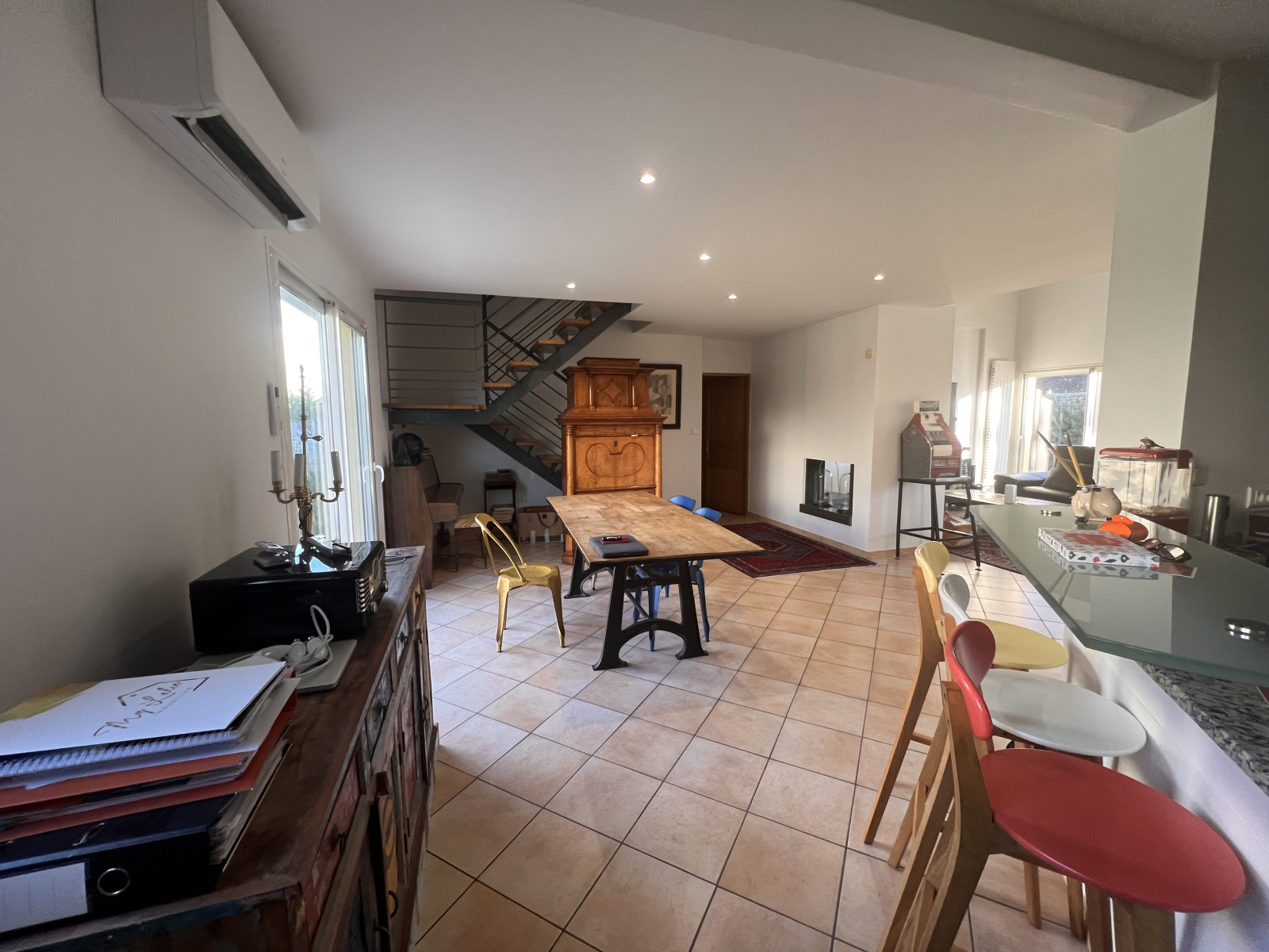 Les volumes généreux et la luminosité naturelle structurent les espaces de vie, pensés pour une circulation fluide et une convivialité raffinée. Le séjour, agrémenté d’une cheminée, invite à la détente dans une atmosphère chaleureuse et sophistiquée.